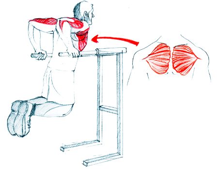 The dip primarily works your chest and triceps, but also works the front of your shoulders.