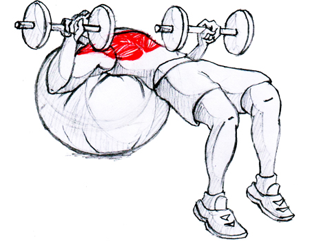Lying on an unstable ball, instead of a bench, makes the chest press more challenging because you also need to stablize yourself on the ball while lifting the dumbbells. You should try to have the ball move as little as possible during the exercise.