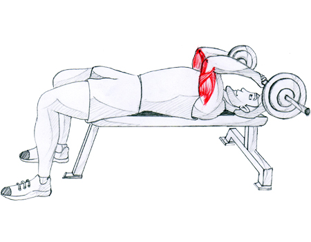 The lying barbell triceps extension is an advanced exercise that works your triceps and forearms. This exercise, which is also known as French Press or the Skull Crusher, strengthens and builds mass in your triceps.