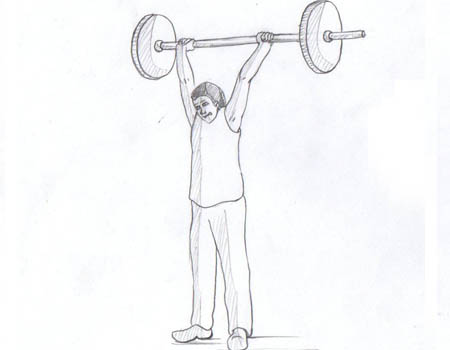 - Finish with arms straight and the bar locked out overhead. At the same time, the hips come back slightly so that there is a slight curve in the lower back at the end. This helps to give the drive some extra oomph when the weight gets heavy.
