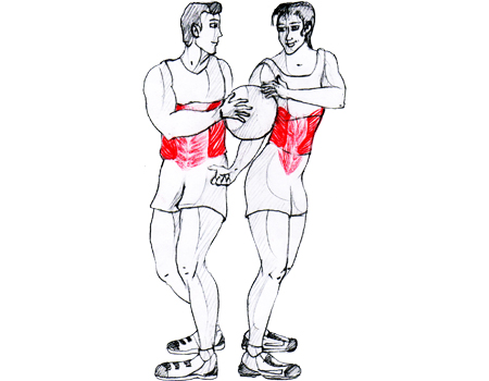 - Stand with a partner with your backs touching. Pass a ball (basket ball or a football) from one side to your partner. The partner receives the ball and passes the ball back from the other side.